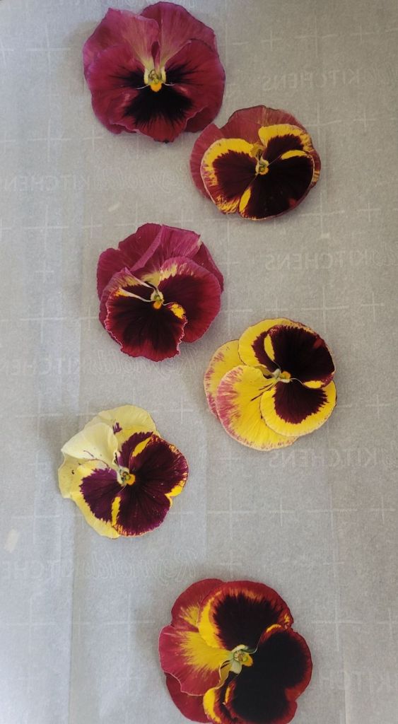 I clipped some blooms to press between parchment. I plan to put these in a frame in the Pansy Room.