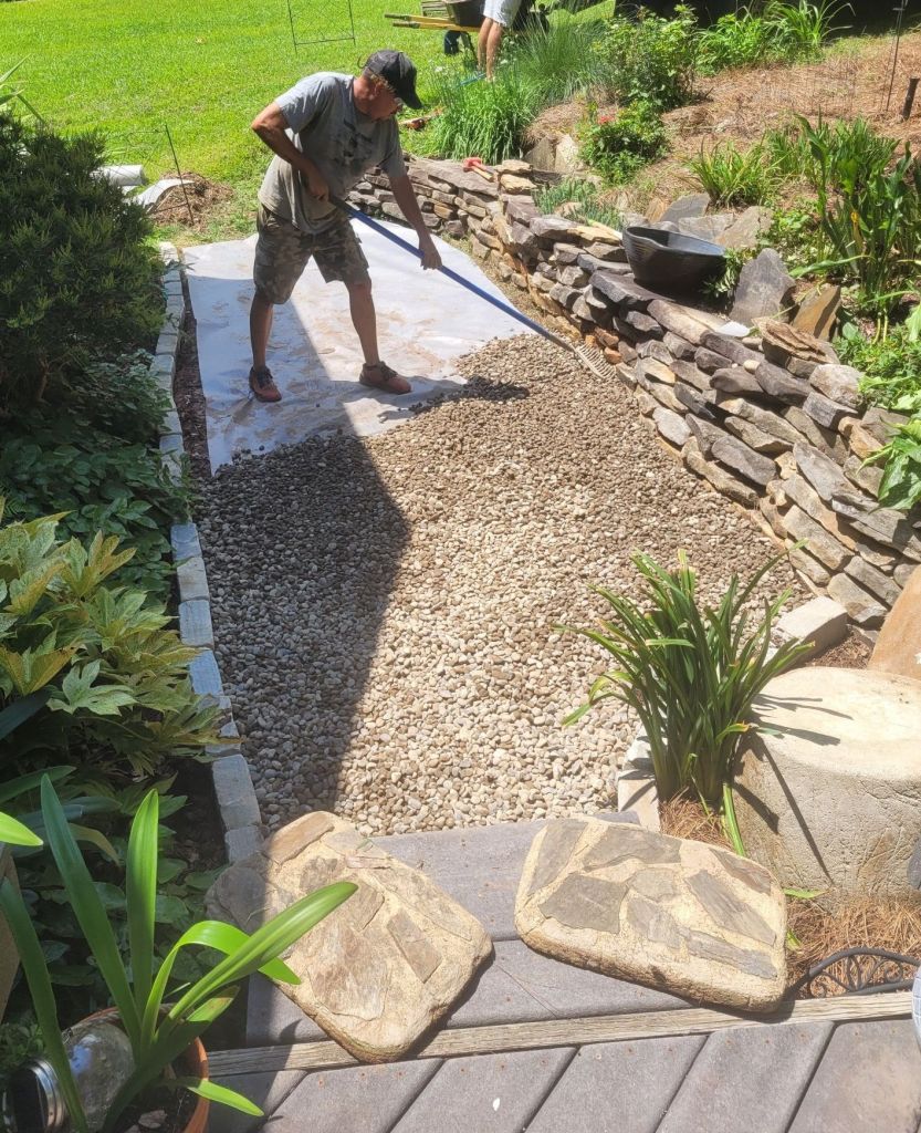 Then a crew came and put in a cut-stone perimeter, geocloth and colored pebbles.