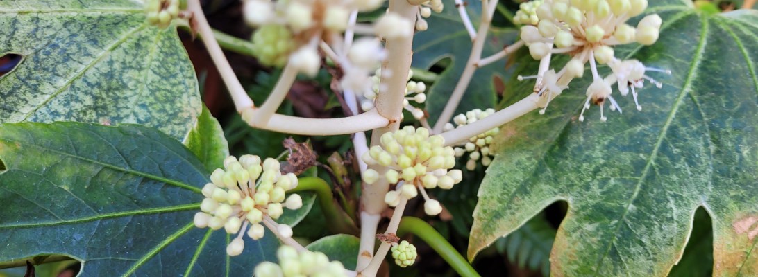 I fell in love with its variegated leaves. You can see why its name is ‘Spider’s Web’ Fatsia japonica.