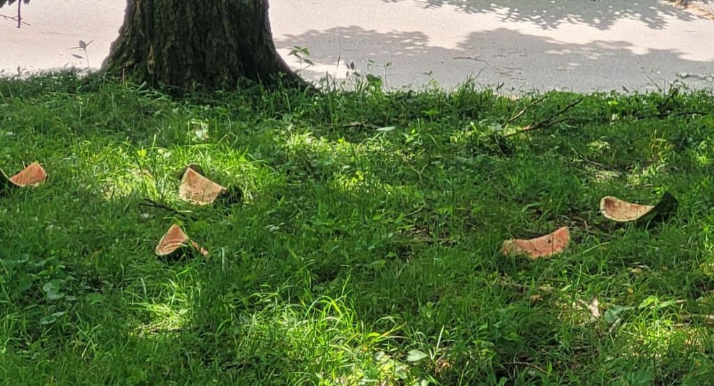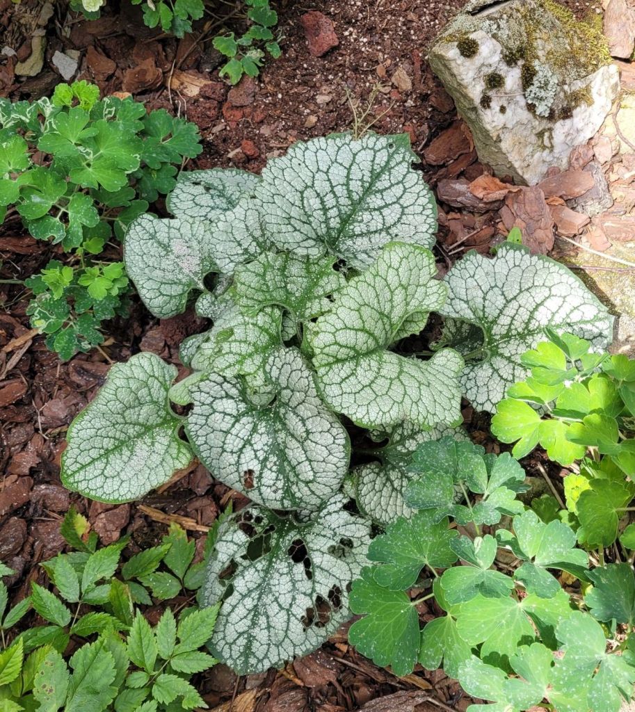 It seems slugs are eating this Brunnera. I have not witnessed this, so plan to come out after dark to investigate. It too will be surrounded by Little Green Slug Tiki Bars.