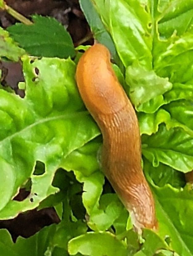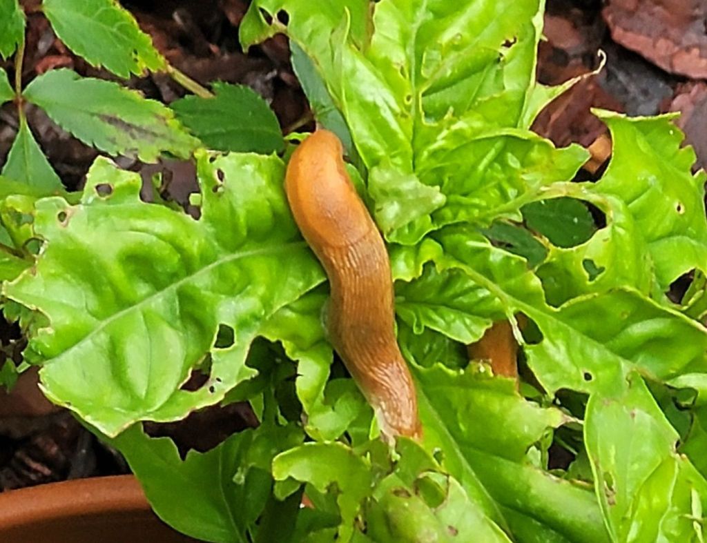 My only basil plant has been demolished. When I moved the pot, there was a slug sleep-over in progress underneath.
