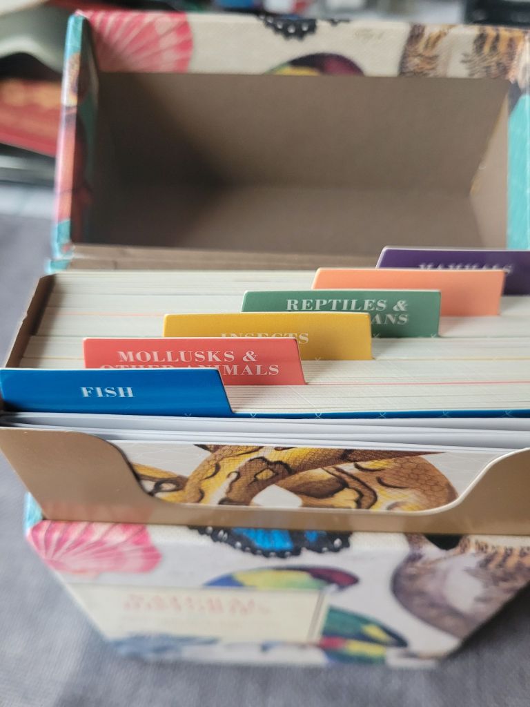 The cards are arranged by the common names of animal phyla in order of complexity: fish, mollusks, insects, amphibians, reptiles, birds and mammals.