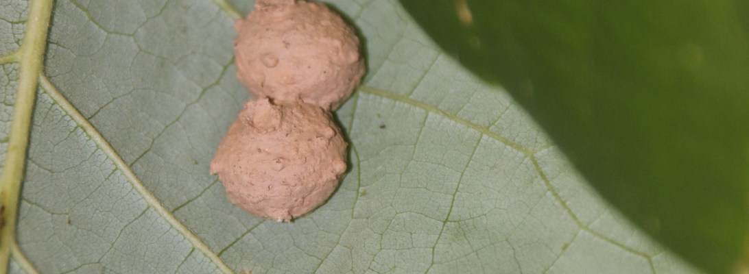 Two tiny jugs made of mud, side-by-side on a Magnolia grandiflora leaf.