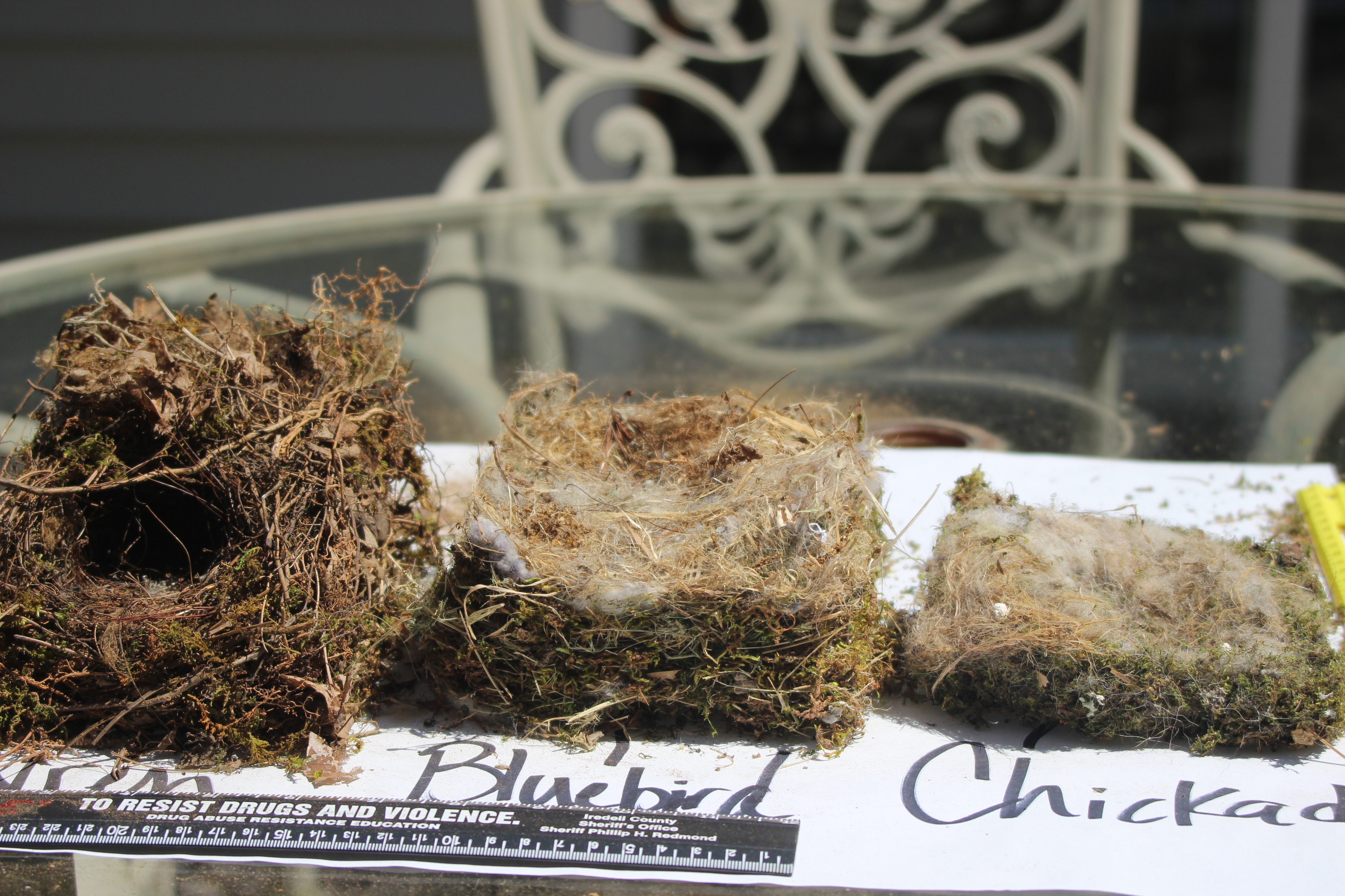 The Eastern Bluebird lays 4-6 light blue eggs in a loose, cup-like nest. All three nests included pine needles and moss.