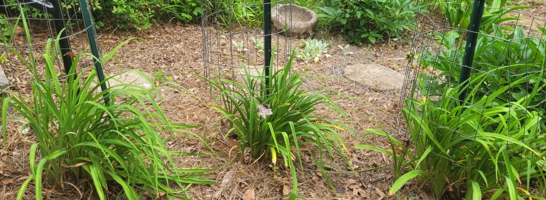 I may be a weakened and injured warrior, but I still have a fighting heart for my green babies. It is past time for Deer Protection Phase II. That means that fence rings were put around all deer delicacies to protect the emerging foliage, but no stakes were in place to hang the rings.