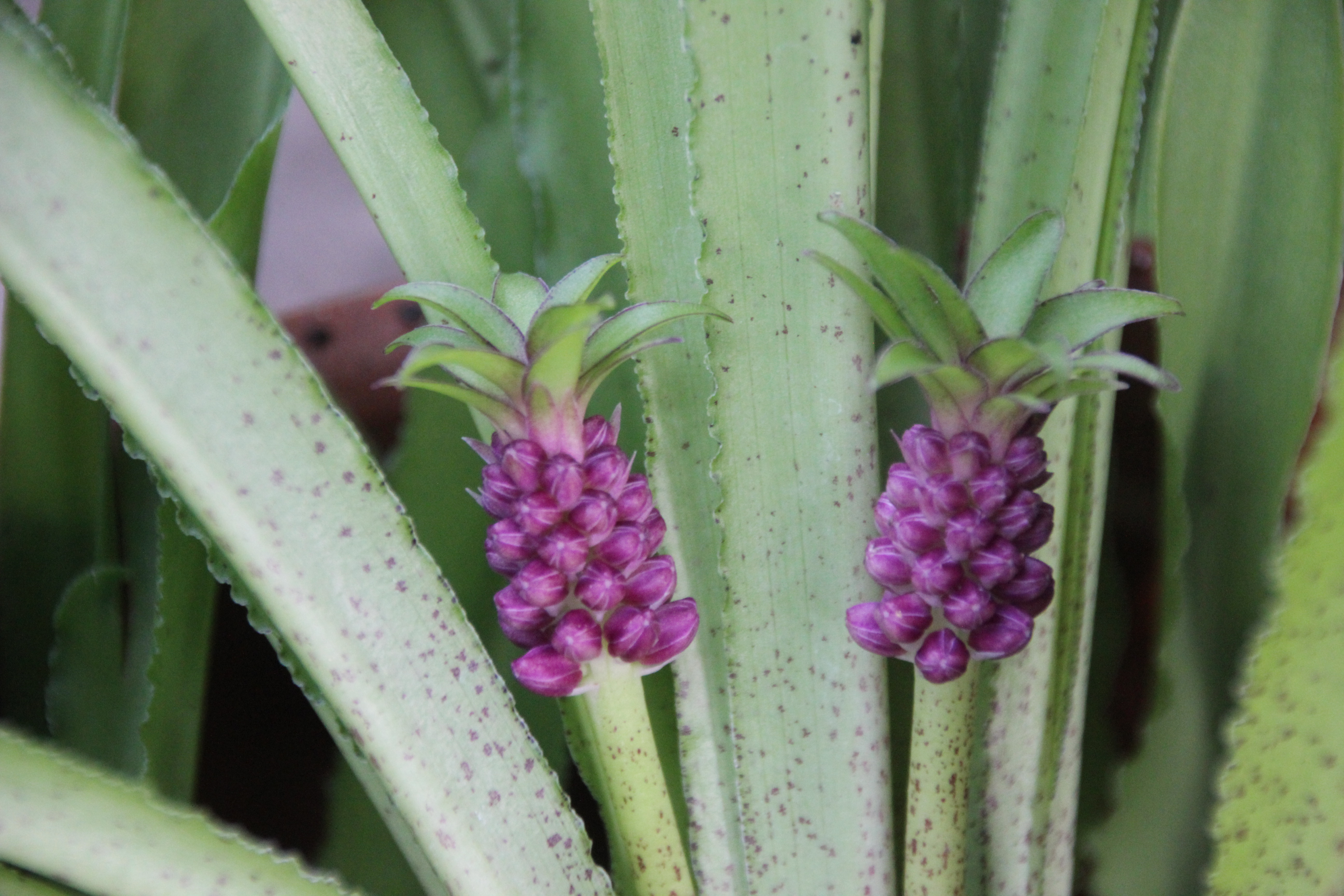 The spikes of both resemble elongated pineapples with blooms covering the sides and a tuft of green on top.