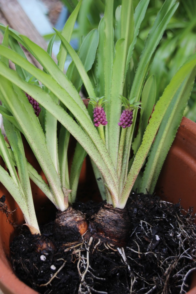 A tiny version of Eucomis stays in pots. Its name is ‘Aloha.’ The blooms are the size of a thumbprint.