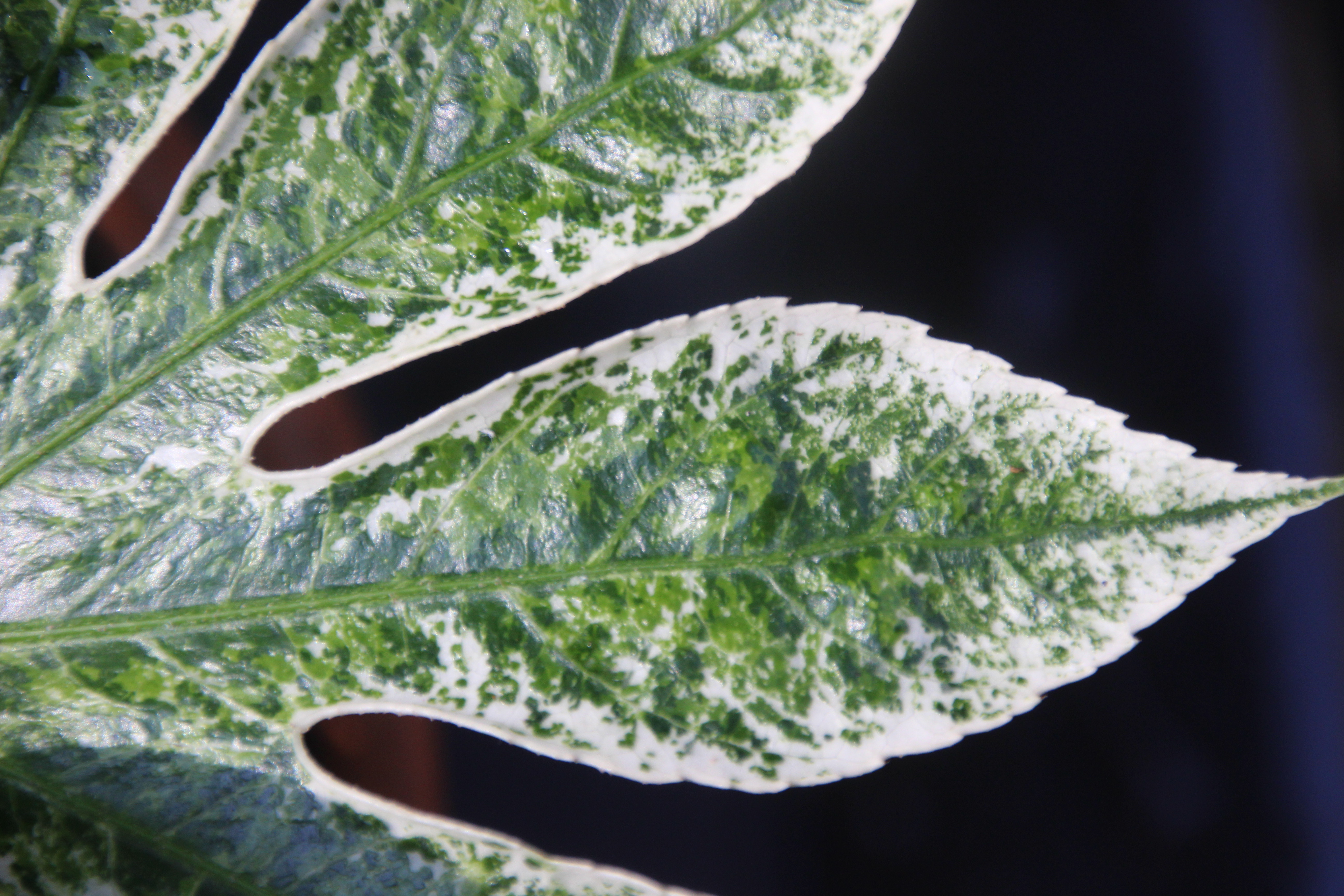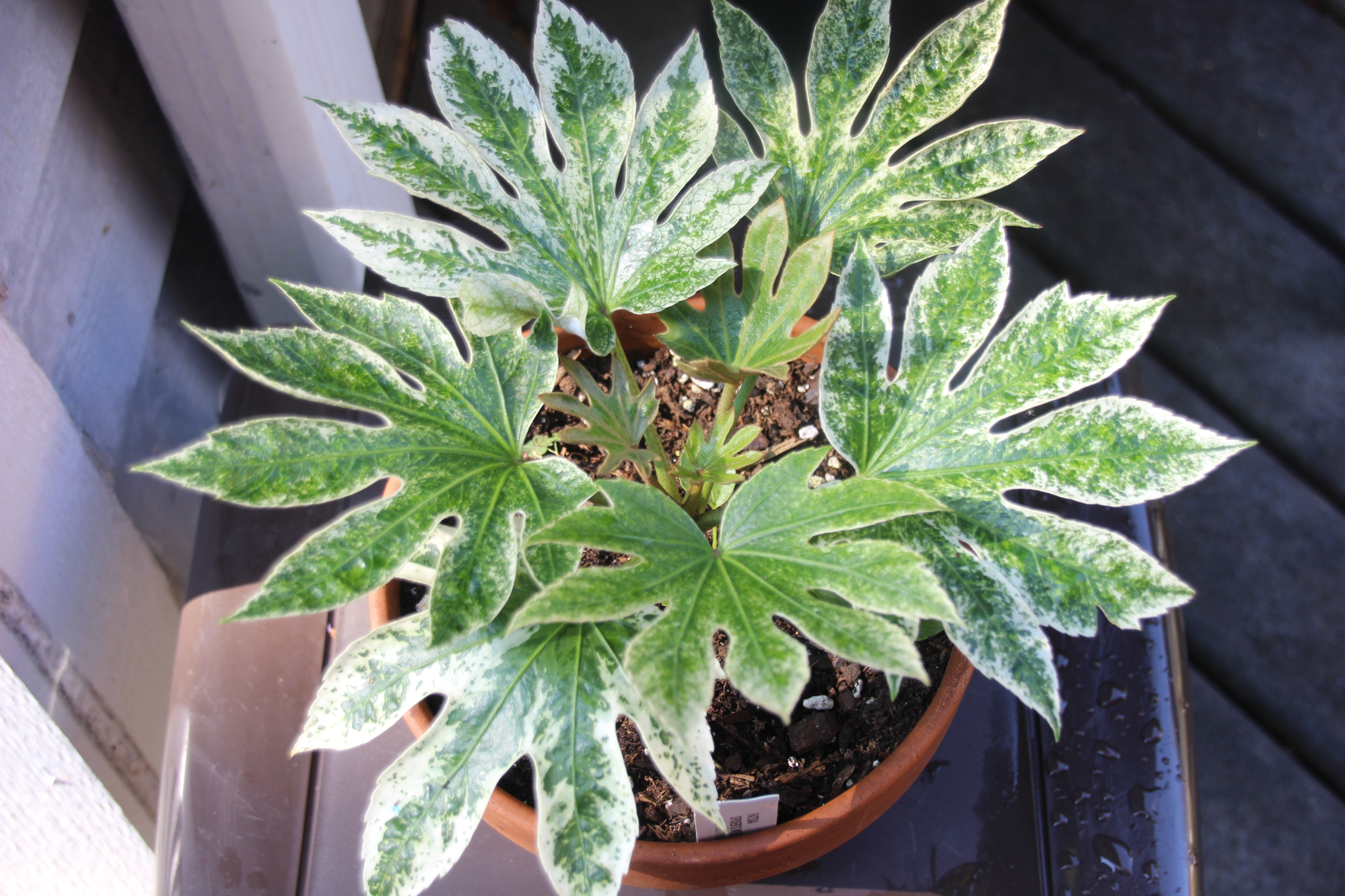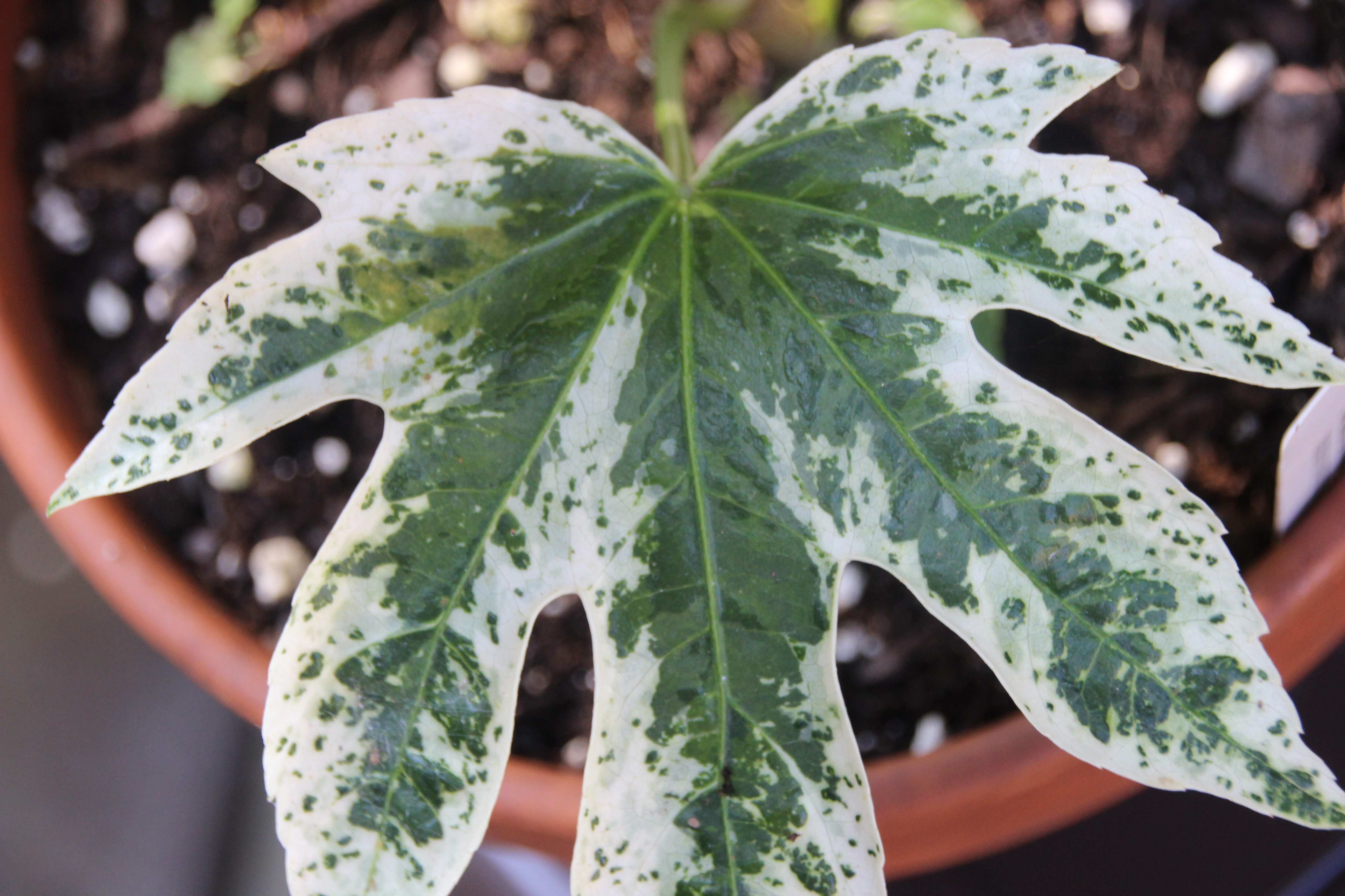 I fell in love with its variegated leaves. You can see why its name is ‘Spider’s Web’ Fatsia japonica.