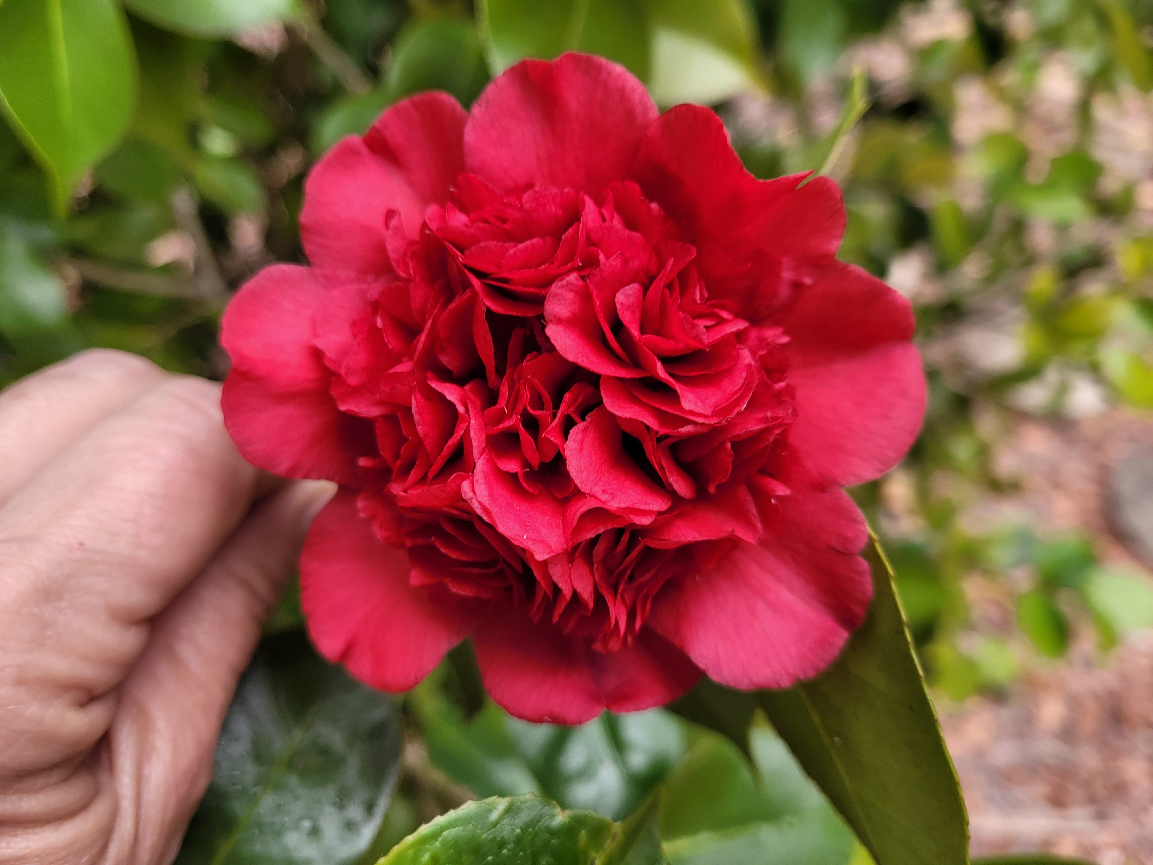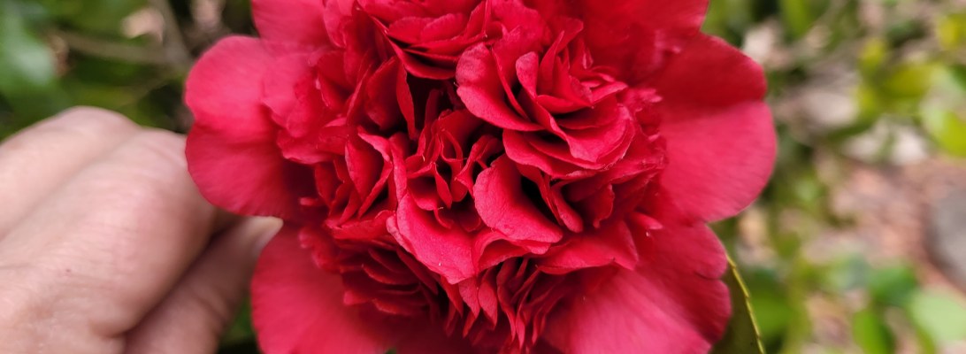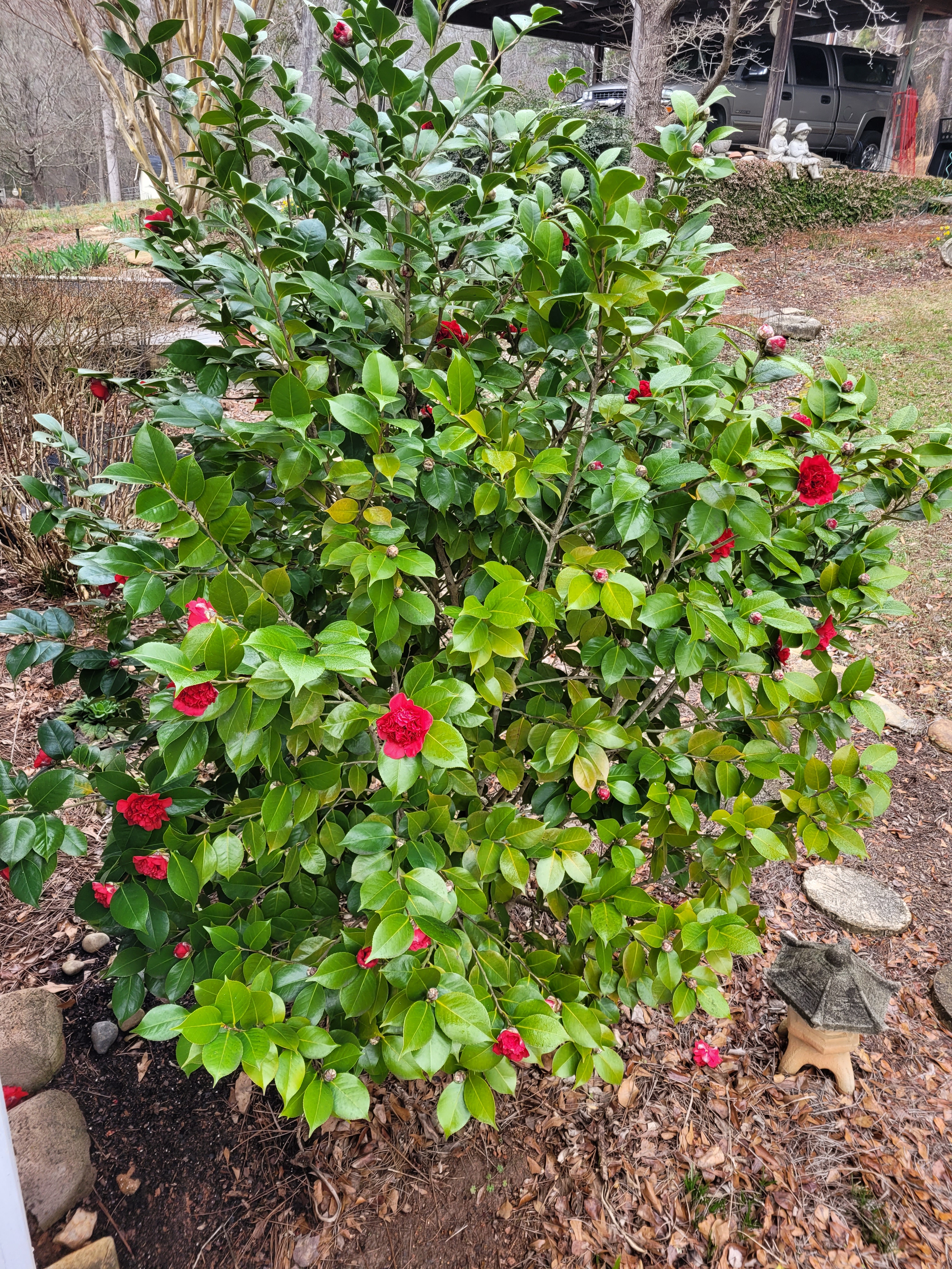 All I need is a tiny reminder of what is to come. These little signs of spring get me through the dark, short days. My Professor Sargeant Camellia japonica has sent out one perfect bloom from all of its hundreds of buds.